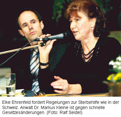 Elke Ehrenfeld, Präsidiumsmitglied der Deutschen Gesellschaft für Humanes Sterben (DGHS), spricht sich klar für das „selbstbestimmte Sterben“ aus. Die gelernte Krankenschwester hofft auf eine gesetzliche Regelung wie in der Schweiz. Dort darf der Arzt den Freitod nach festgelegten Kriterien begleiten. Ehrenfeld sagt auch: „Wenn meine Krebskrankheit weiter geht, fahre ich in die Schweiz.“
