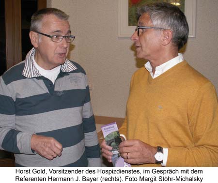 Dazu eingeladen hatte der Hospizdienst Weinsberger Tal. Der Verein bietet neben der ambulanten Begleitung Schwerstkranker und Sterbender auch Vorträge mit den Themen, Tod, Trauer und Leben an, um Hilfestellung zu geben und Gespräche zu ermöglichen. Der Vorsitzende Horst Gold hatte Hermann J. Bayer bereits als Diakon in der katholischen Kirche und als Psychiatrieseelsorger in Weinsberg (von 1978 bis 1985) kennengelernt. Der ausgebildete Sozialpädagoge schlug danach den Weg der Trauerbegleitung ein und gründete das erste „Lebenscafe" in Stuttgart.