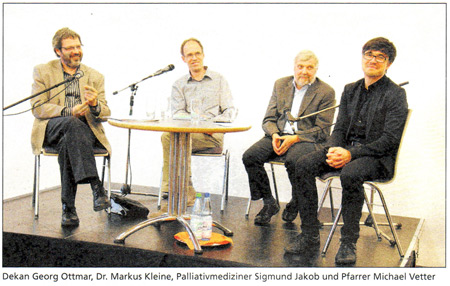 Dekan Georg Ottmar möchte „von unserem christlichen Menschenbild einen Blick auf dieses Thema werfen. Unsere Menschenwürde ist nicht aus uns selbst gegeben, sondern von Gott. Deshalb ist sie unantastbar". Das christliche Verständnis von Leben gehe auch über den Tod hinaus. Seine Erfahrungen zeigten, das Schlimmste am Sterben sei die Angst vor dem Sterben, vor den Schmerzen, vor dem langsamen Dahinsiechen. Bei der Sterbehilfe richte sich seine Frage an den Mediziner: „Wo sind die Grenzen, zum Beispiel wenn der Patient vom Arzt eine aktive Sterbehilfe fordert". Töten auf Verlangen sei nach wie vor strafbar, macht Kleine deutlich. Dies werde in manchen Ländern zum Teil anders gesehen, wie Beispiele in Holland und der Schweiz zeigen.